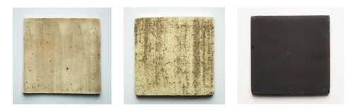 Clay tiles fired with: copper powder, copper powder + glaze, indentation filled with copper powder, copper powder, copper wire, copper wire in glaze